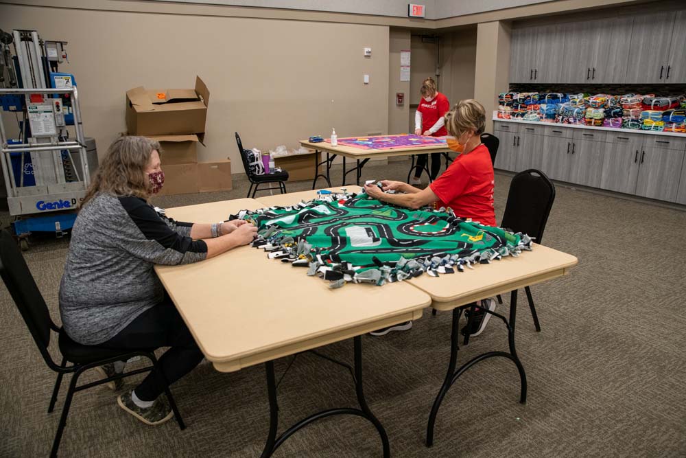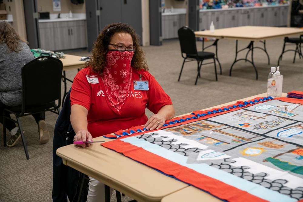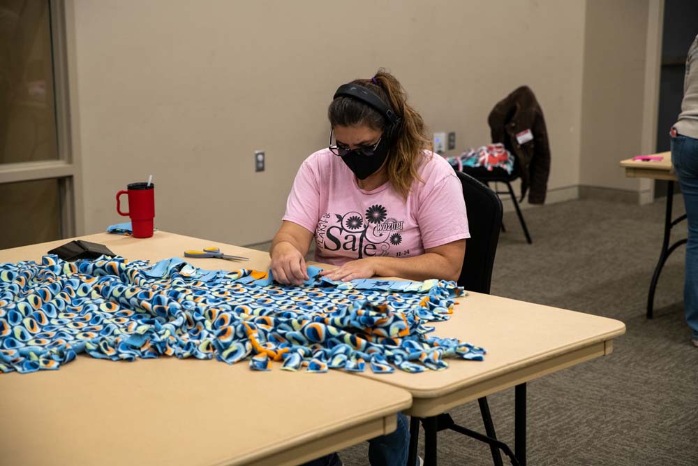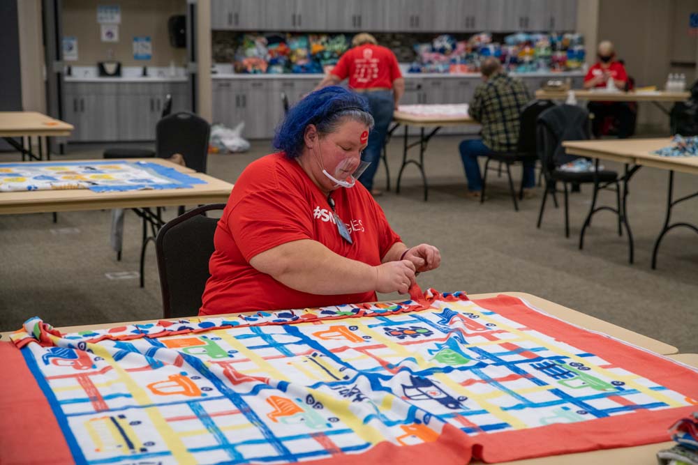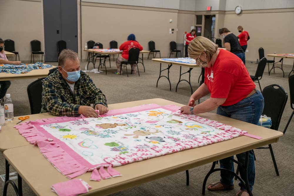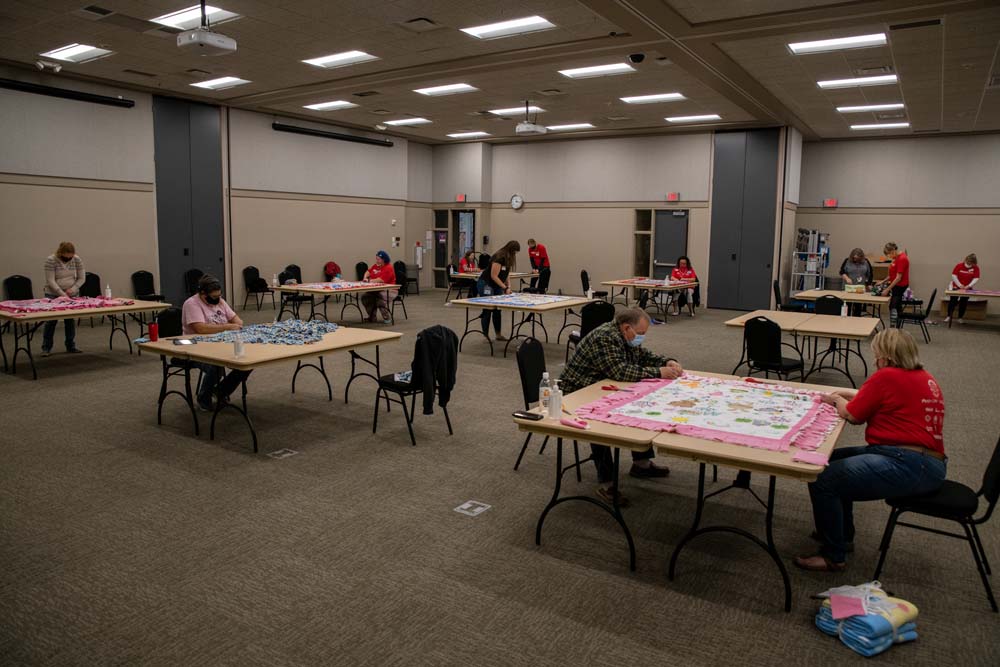 Volunteers Assemble Fleece Blankets for Children in Need